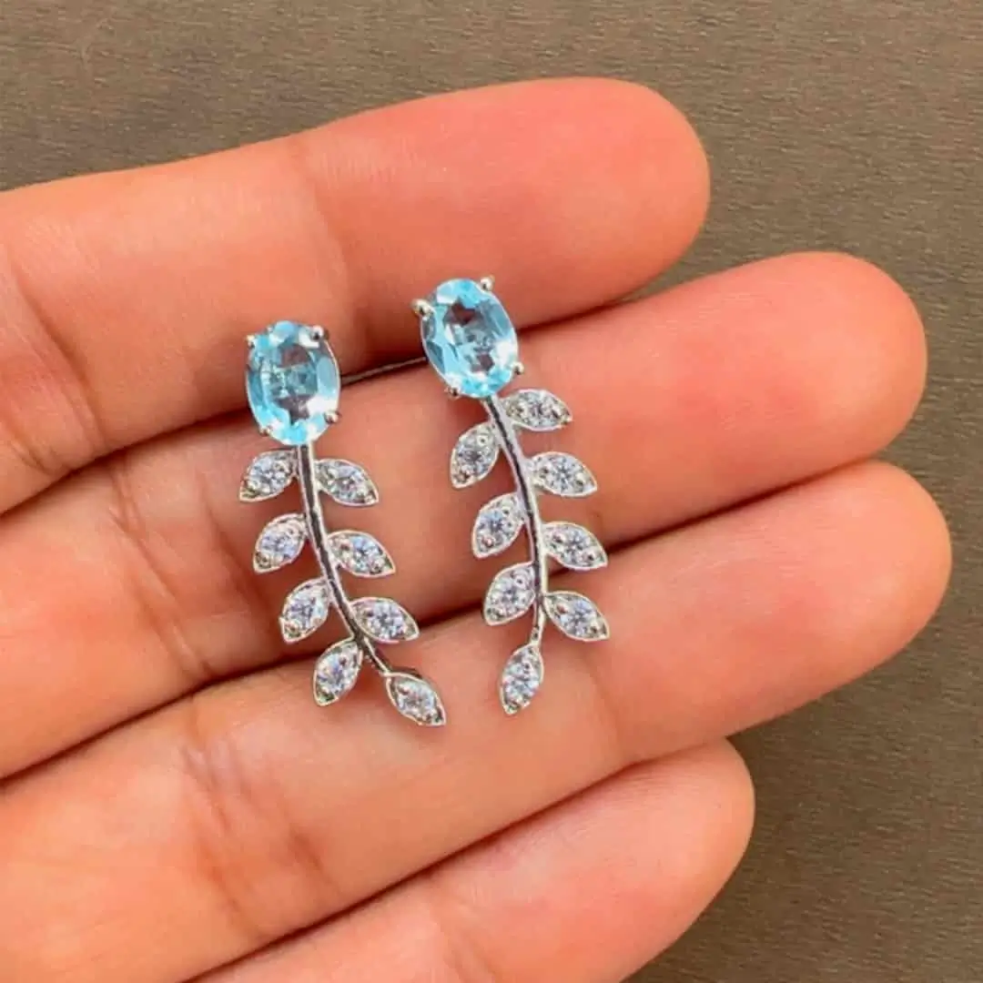 Silver Earrings (Leaves) with 5×7 mm oval shaped Blue Topaz Gemstone and Cubic Zirconia