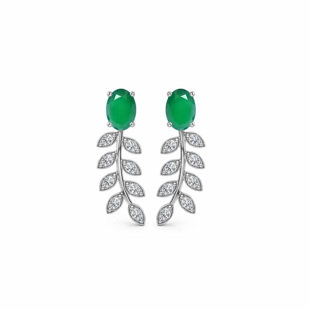 Silver Earrings (Leaves) with 5×7 mm oval shaped Green Onyx Gemstone and Cubic Zirconia