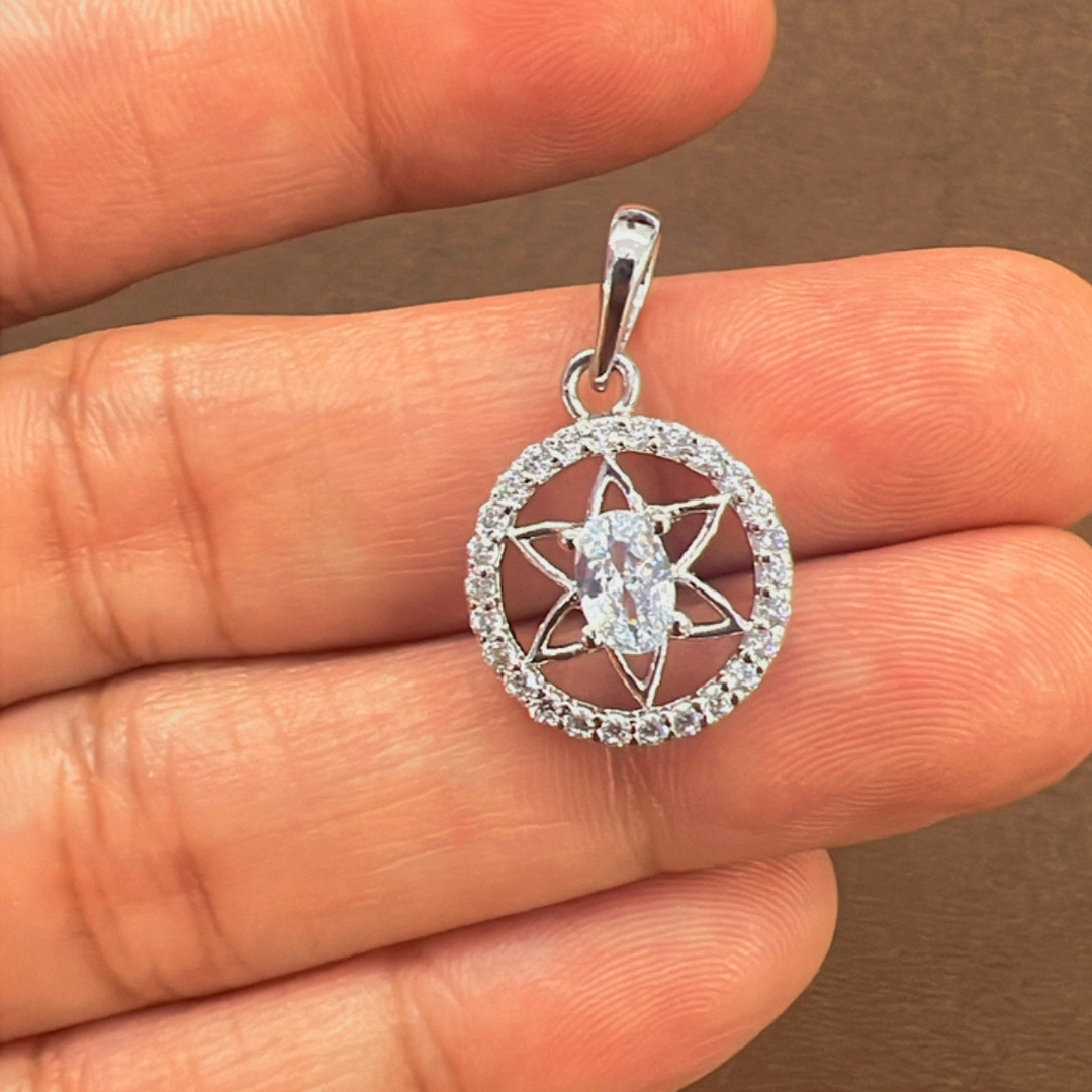Silver Pendant (Flower shaped) with 6X4mm Oval Cubic Zirconia Gemstone and small round Cubic Zirconia