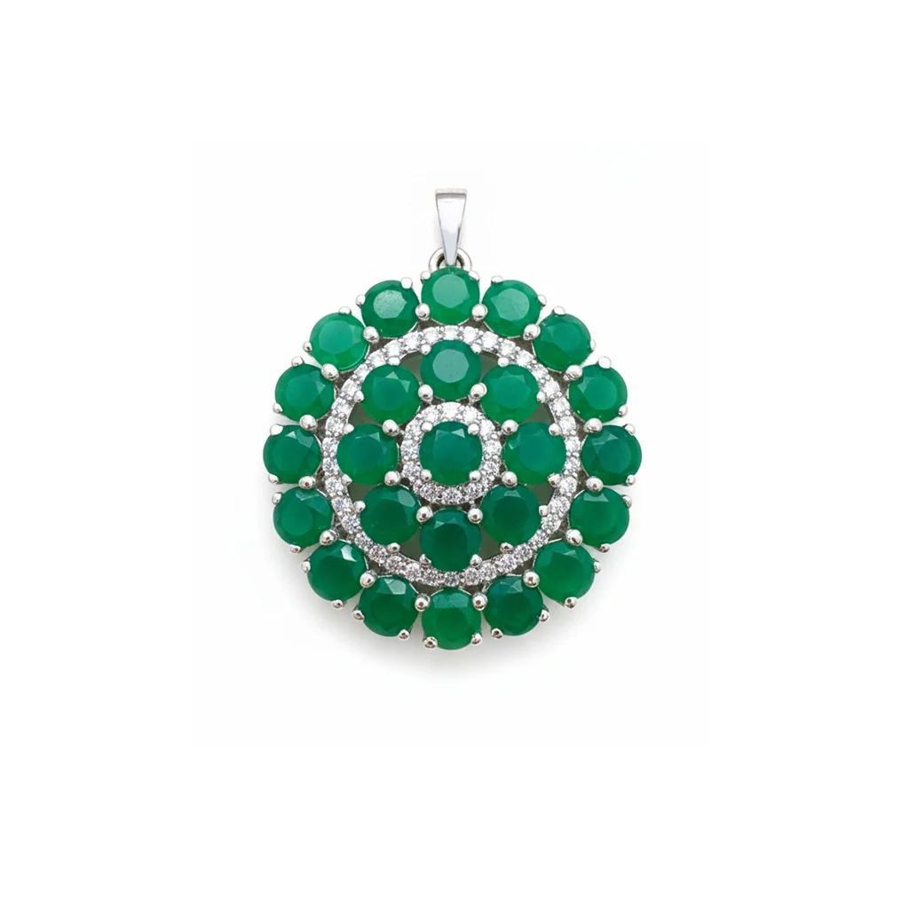 Silver Pendant (round shaped) with 5mm round shaped Green Onyx Gemstone and small round Cubic Zirconia