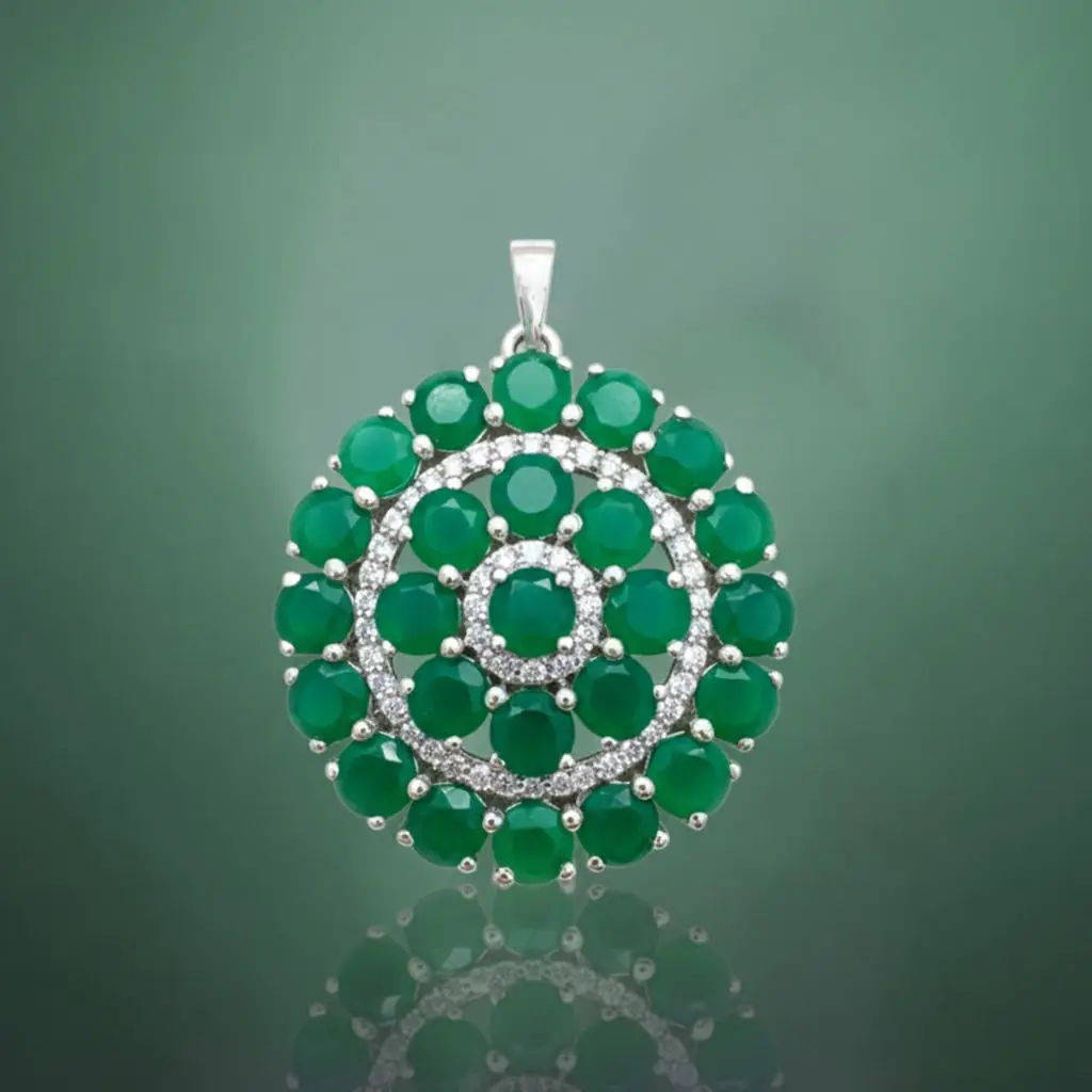 Be the first to review “Silver Pendant (round shaped) with 5mm round shaped Green Onyx Gemstone and small round Cubic Zirconia”
