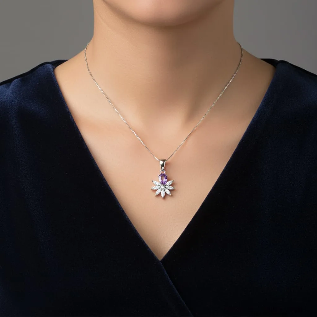 - Gemstone Details: 5x7mm pear Brazilian Amethyst cut (1pc) & round shaped Cubic Zirconia (14pcs)