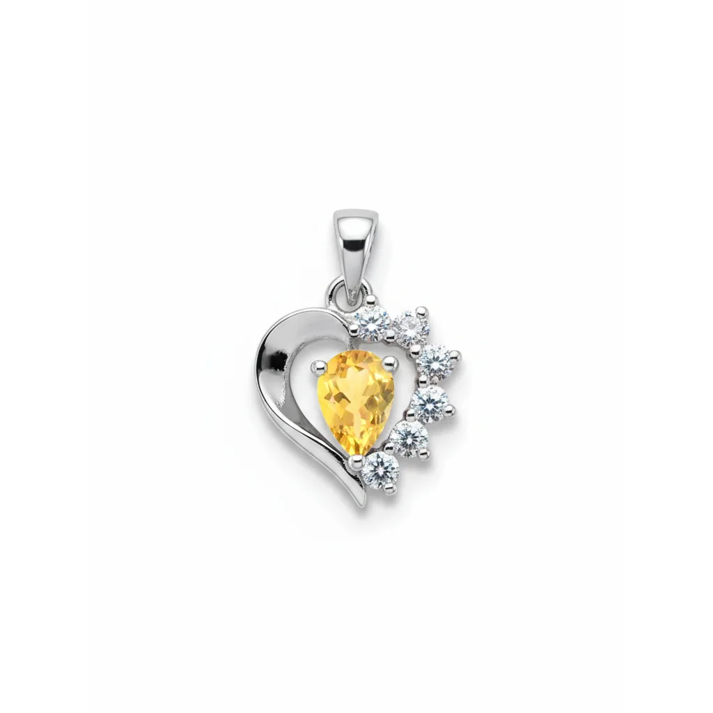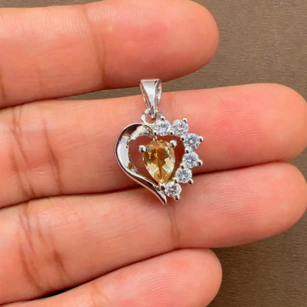 Silver Pendant heart shaped with 5x7mm pear shaped Citrine Gemstone and small round Cubic Zirconia