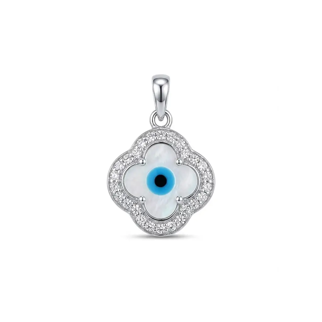 Silver Pendant cluster with 10mm clover shaped Evil Eye Gemstone and small round Cubic Zirconia