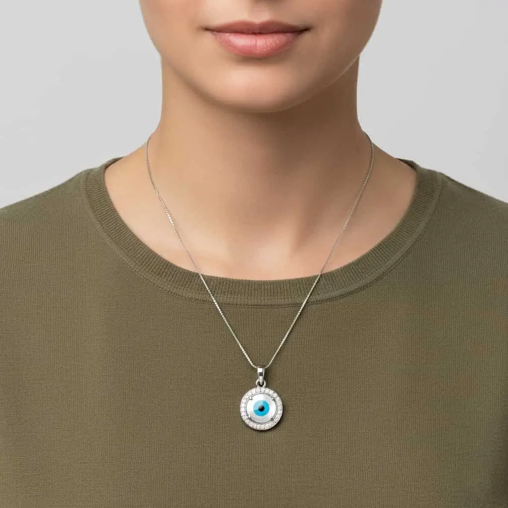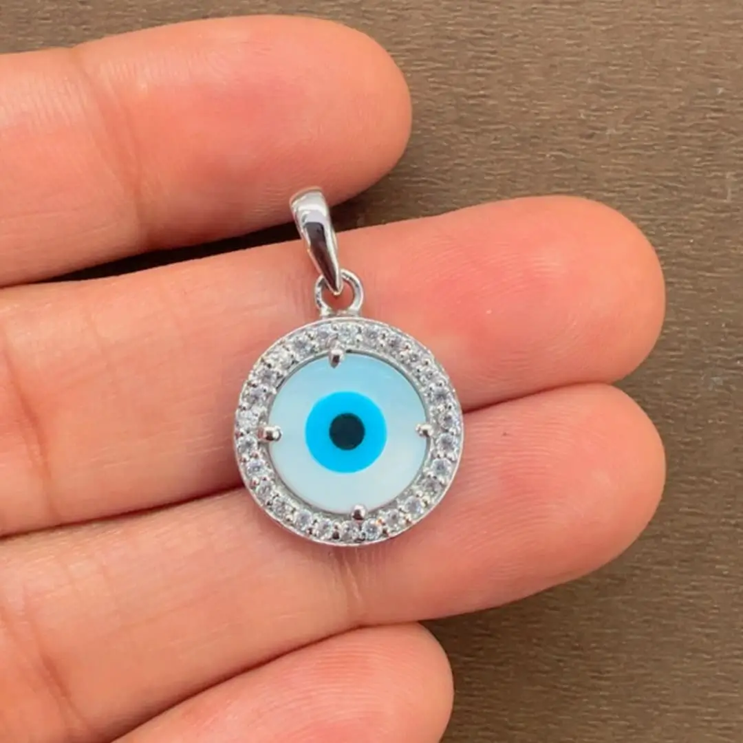 Silver Pendant cluster with 10mm round shaped Evil Eye Gemstone and small round Cubic Zirconia