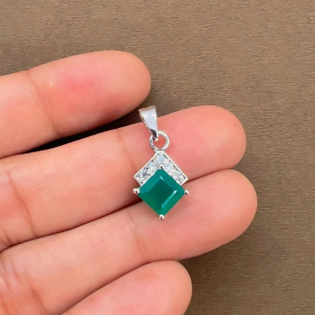 Silver Pendant with 6mm square shaped Green Onyx Gemstone and small round Cubic Zirconia