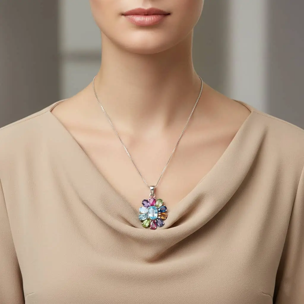 Silver Pendant flower shaped with 6x8mm & 6x4mm Oval Multi Gemstone