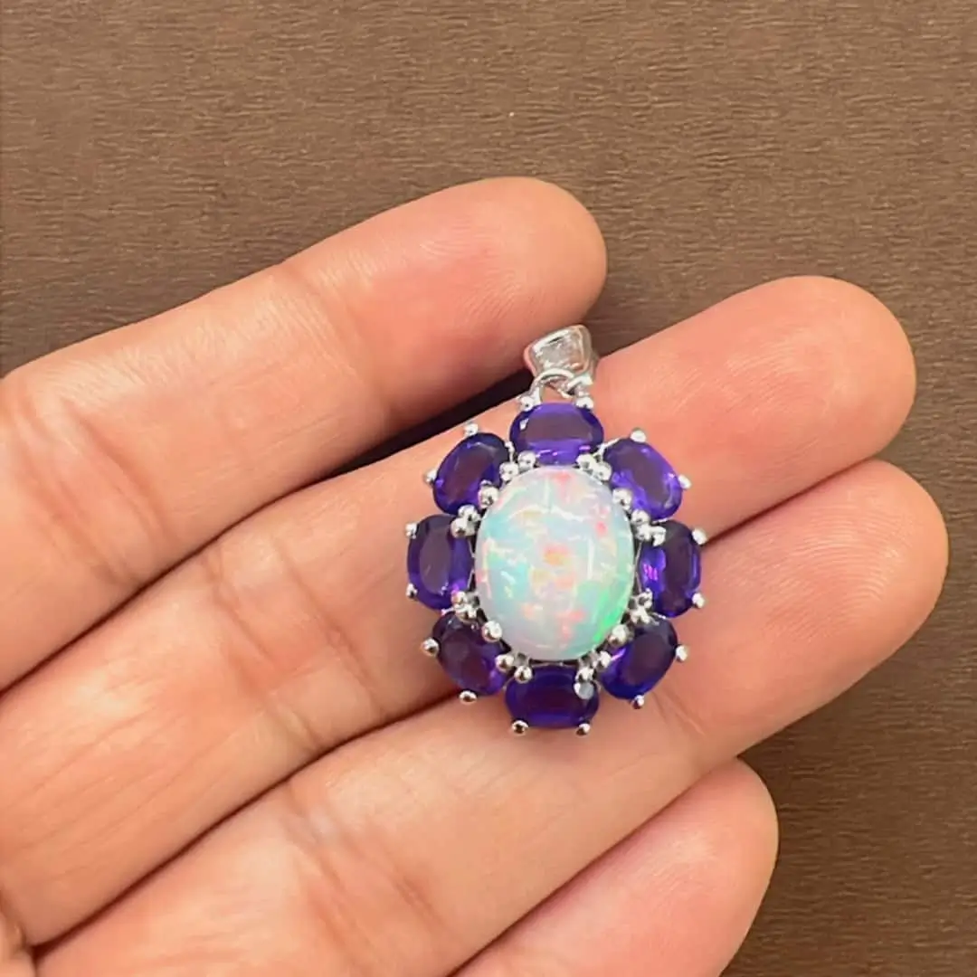 • Gemstone Details: 10×12 mm oval Opal cut (1pc) and 6×4 mm oval Amethyst (8pcs)