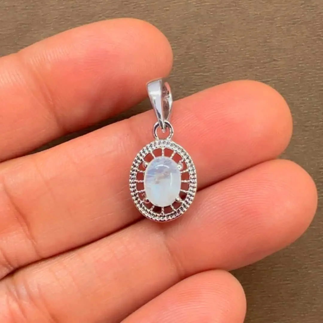 Silver Pendant with 5x7mm oval Rainbow Moonstone cabochon Gemstone