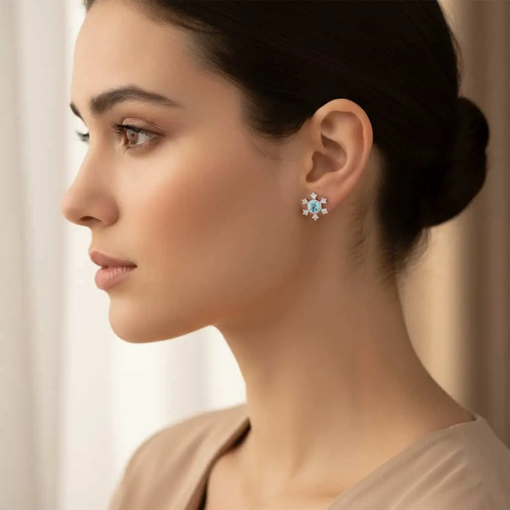 Be the first to review “Silver Studs snowflake design with 5mm round Blue Topaz Gemstone and Cubic Zirconia”