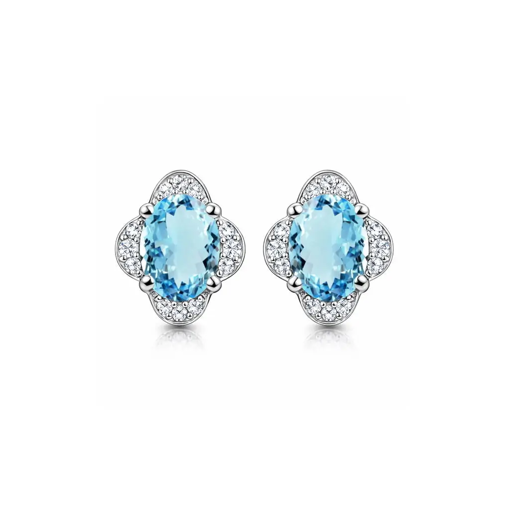 Silver Studs with 7x9mm oval Blue Topaz Gemstone and Cubic Zirconia