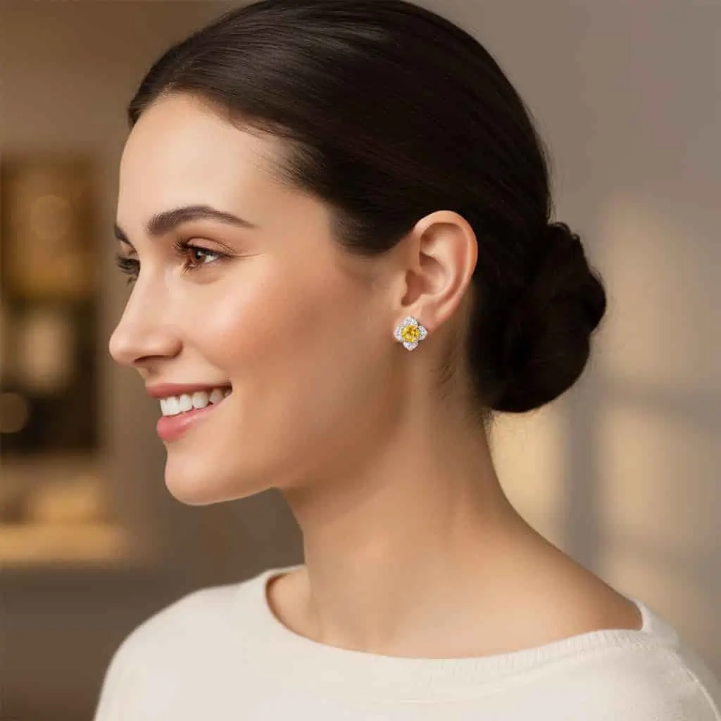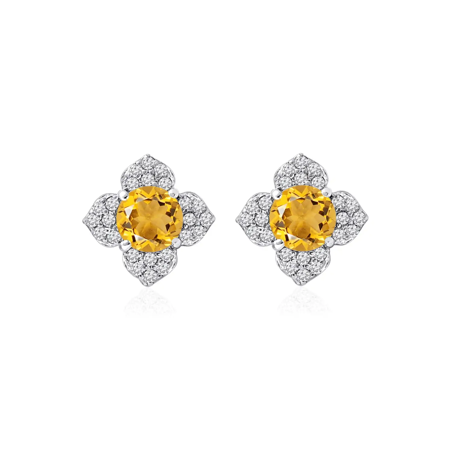 Silver Studs Flower shaped with 6mm round shaped Citrine Gemstone and Cubic Zirconia
