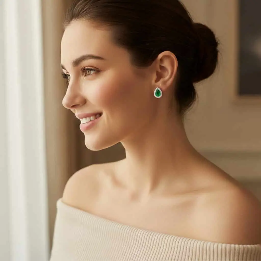 • Gemstone Details: 5×7 mm pear Green Onyx cut (2pcs)  and small round Cubic Zirconia (32pcs) in Prong Setting