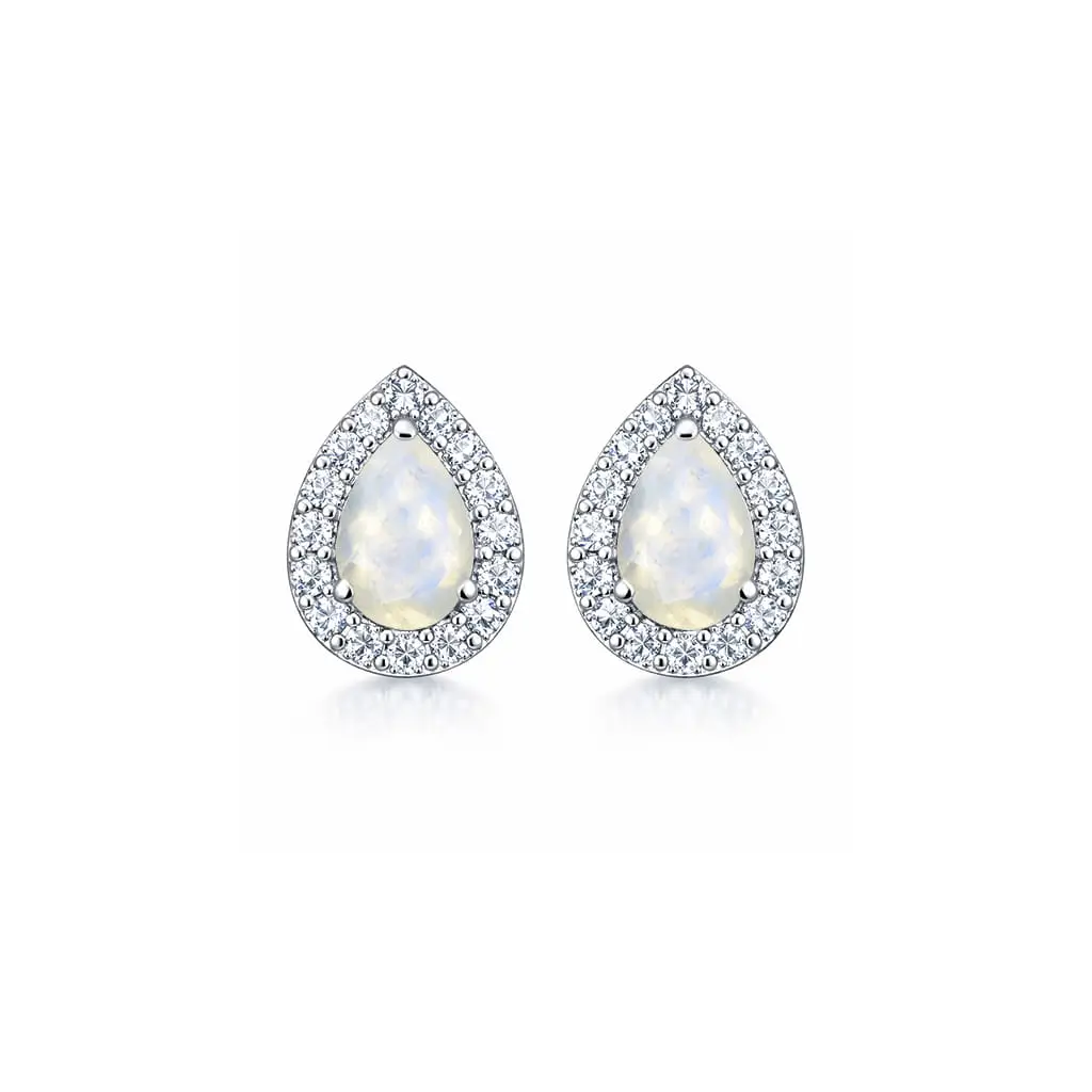 Silver Studs Cluster with 5x7mm Pear shaped Rainbow Moonstone Gemstone and Cubic Zirconia