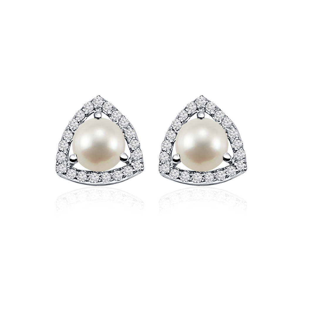 Triangular Shaped Cluster Silver Studs with 6mm Round Pearl Gemstone & small round Cubic Zirconia